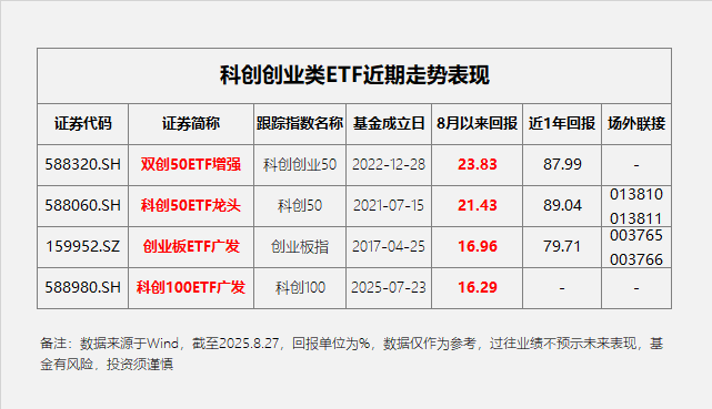 硬科技企業(yè)多在科創(chuàng)板、創(chuàng)業(yè)板上市,投資者可以通過(guò)相關(guān)指數(shù)基金把握機(jī)遇。其中,科創(chuàng)50指數(shù)作為科創(chuàng)板核心資產(chǎn)的“風(fēng)向標(biāo)”,聚焦市值大、流動(dòng)性好的50只證券,其中半導(dǎo)體產(chǎn)業(yè)占比超過(guò)60%,匯聚了如中芯國(guó)際、寒武紀(jì)、海光信息等細(xì)分行業(yè)龍頭。科創(chuàng)50ETF龍頭(588060)緊密跟蹤該指數(shù),8月以來(lái)收益率21.43%,近一年回報(bào)達(dá)89.04%,為投資者提供了布局科創(chuàng)板頭部企業(yè)的便捷工具。另外,對(duì)于希望更廣泛覆蓋科創(chuàng)板中等市值公司的投資者而言,跟蹤科創(chuàng)板100指數(shù)的科創(chuàng)100ETF廣發(fā)(588980)或更適合,其自7月23日成立以來(lái)區(qū)間(7.23-8.27)上漲16.22%,成分股涵蓋博瑞醫(yī)藥、睿創(chuàng)微納、翱捷科技等創(chuàng)新企業(yè)。