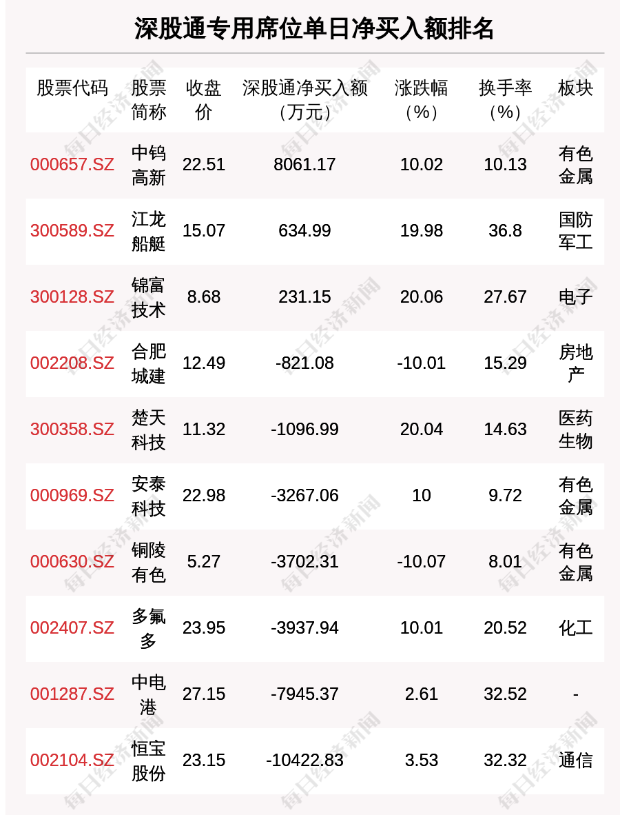 在龍虎榜中,涉及深股通專用席位的個(gè)股有10只,中鎢高新的深股通專用席位凈買入額最大,凈買入8061.17萬元。
