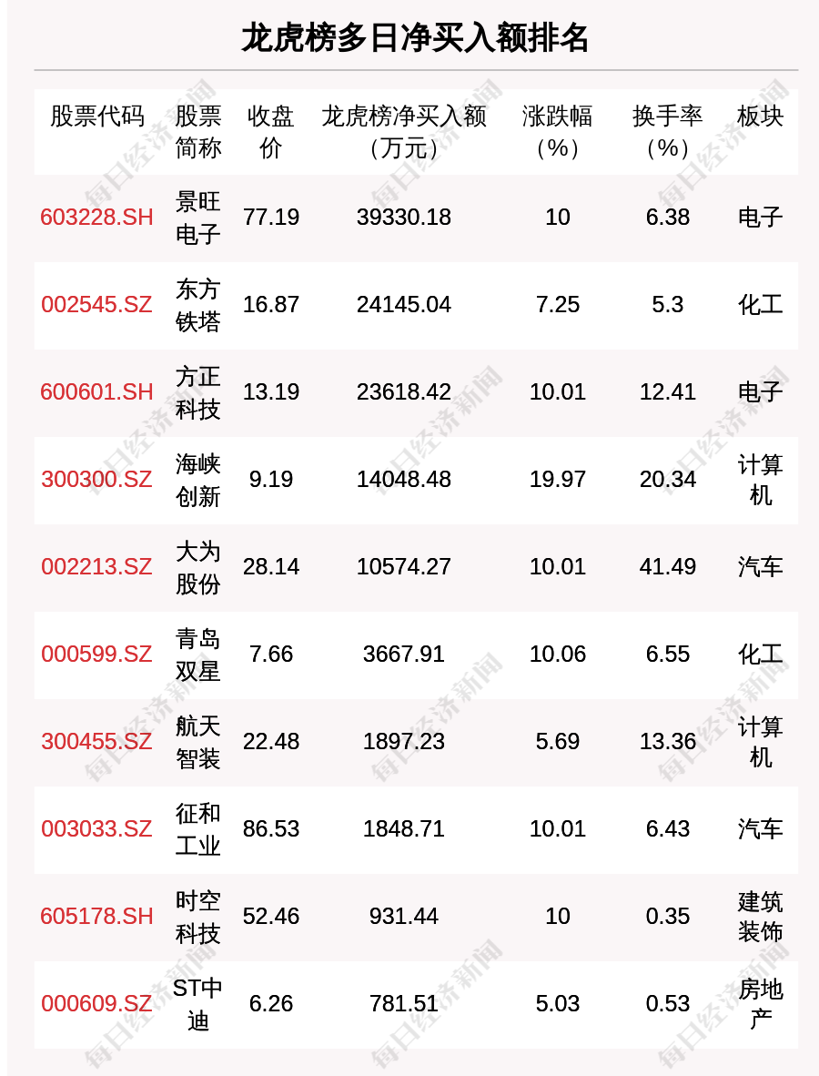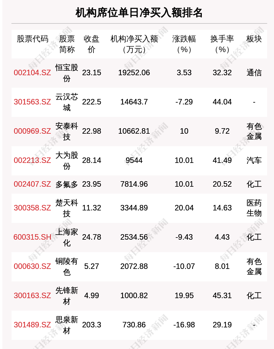 在龍虎榜中,涉及機(jī)構(gòu)專用席位的個(gè)股有20只,凈買入額前三的是恒寶股份、云漢芯城、安泰科技,分別為1.93億元、1.46億元、1.07億元。