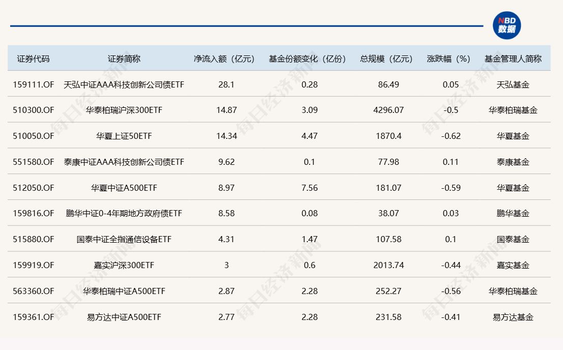 Wind數(shù)據(jù)顯示,在10月28日非貨幣ETF市場(chǎng)中,天弘中證AAA科技創(chuàng)新公司債ETF基金份額增加0.28億份,凈流入額為28.10億元;華泰柏瑞滬深300ETF基金份額增加3.09億份,凈流入額為14.87億元;華夏上證50ETF基金份額增加4.47億份,凈流入額為14.34億元。