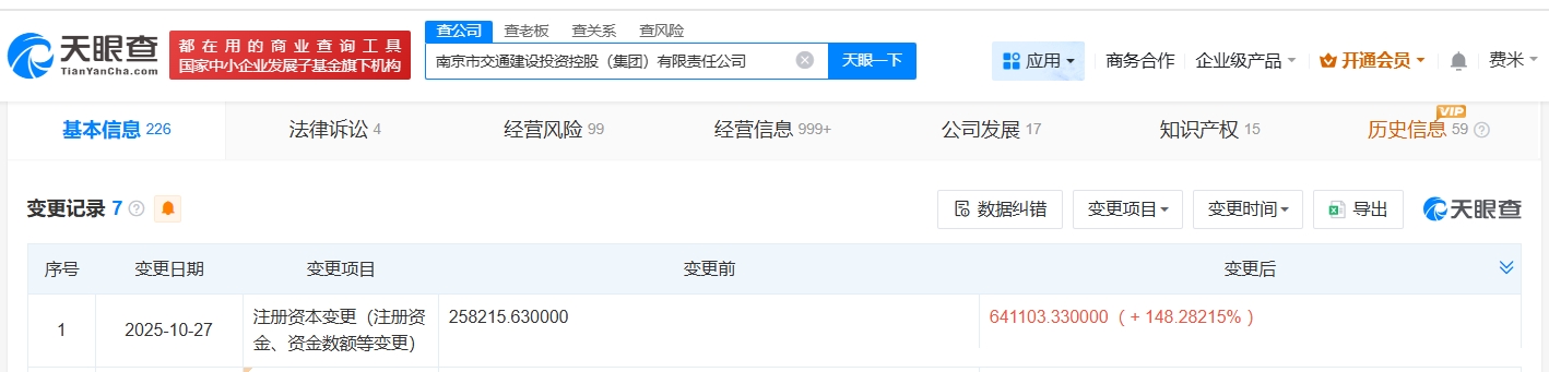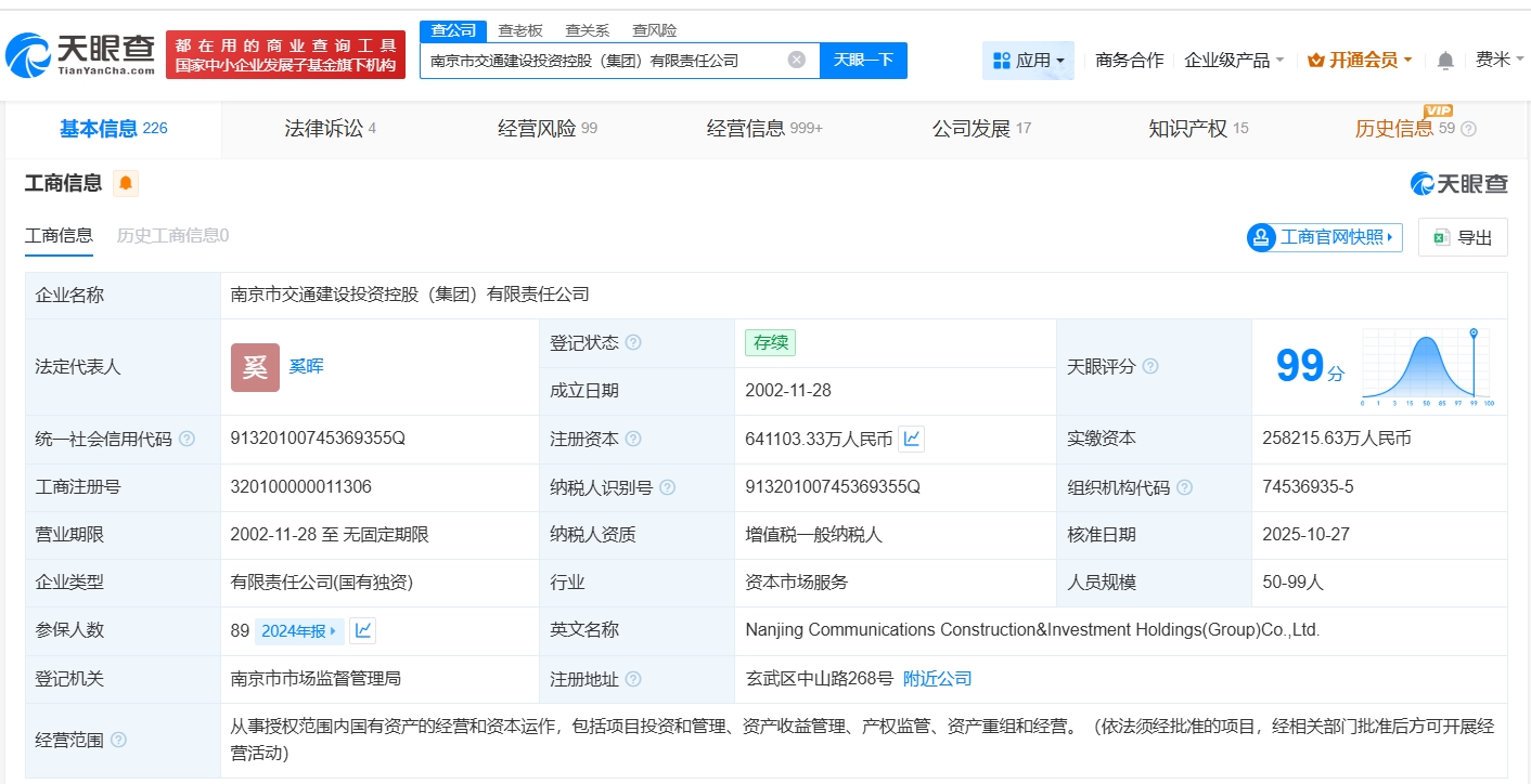 每經AI快訊,天眼查App顯示,近日,南京市交通建設投資控股(集團)有限責任公司發(fā)生工商變更,注冊資本由約25.8億元人民幣增至約64.1億元人民幣,增幅約148%。該公司成立于2002年11月,法定代表人為奚暉,經營范圍為從事授權范圍內國有資產的經營和資本運作,包括項目投資和管理、資產收益管理、產權監(jiān)管、資產重組和經營,由南京市人民政府國有資產監(jiān)督管理委員會全資持股。