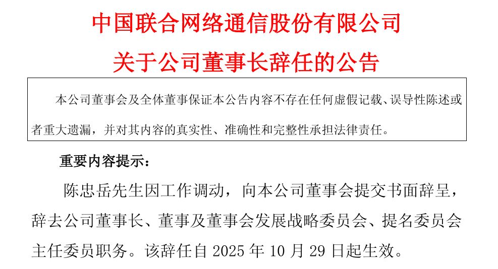 10月29日,中國(guó)聯(lián)通公告,公司董事長(zhǎng)陳忠岳因工作調(diào)動(dòng),申請(qǐng)辭去公司董事長(zhǎng)、董事等職務(wù),該辭任自2025年10月29日起生效。陳忠岳辭任后將不再擔(dān)任公司任何職務(wù)。
