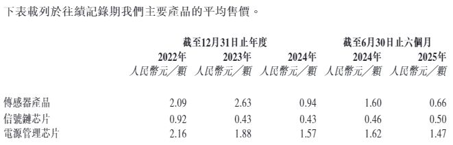 然而,每經(jīng)記者注意到,納芯微的上述三款產(chǎn)品,在報告期內(nèi)的平均售價整體均呈下行趨勢。例如,營收占比最高的信號鏈芯片平均售價從2022年的0.92元/顆降至今年上半年的0.5元/顆,累計降幅46%。同期,營收占比第二高的電源管理芯片從2.16元/顆降至1.47元/顆,累計降幅約32%,傳感器芯片的平均售價則從2.09元/顆降至0.66元/顆,累計降幅達68%。